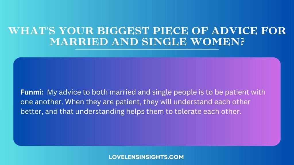 Funmi: My advice to both married and single people is to be patient with one another. When they are patient, they will understand each other better, and that understanding helps them to tolerate each other.